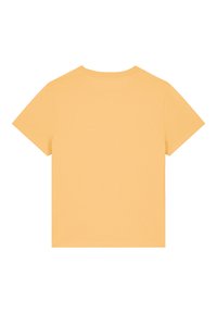 Gelbes Baumwoll-T-Shirt mit einem Pastagrafik in blauen und roten Schriftzug "Vollzeit PASTA LIEBHABER", kurzen Ärmeln und Rundhalsausschnitt.