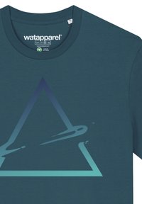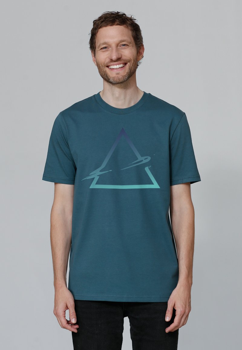 Türkisfarbener Baumwoll-T-Shirt mit einem großen geometrischen Dreiecksdesign in Farbverlauf, kurzen Ärmeln und Rundhalsausschnitt.