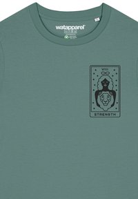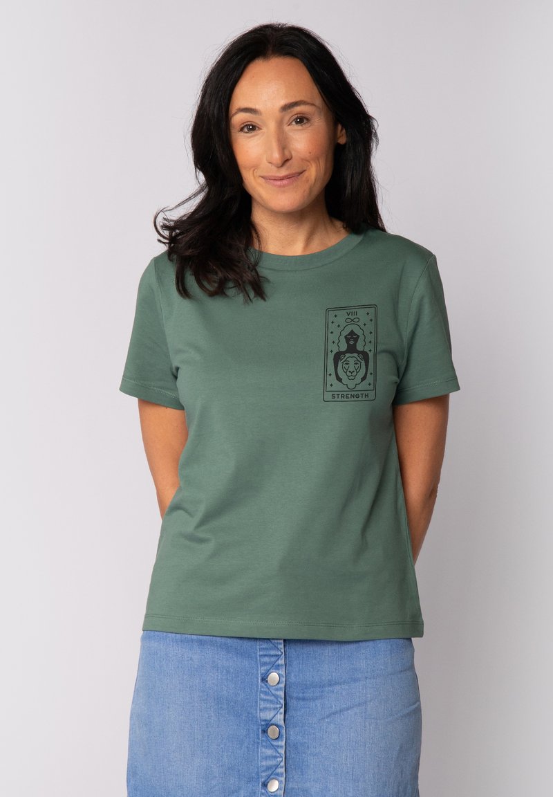 Grünes Baumwoll-T-Shirt mit kurzen Ärmeln zeigt einen schwarzen Grafikdruck einer Tarotkarte, die auf der Brust zentriert ist und einen Löwen sowie das Wort "STRENGTH" darstellt.