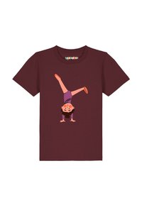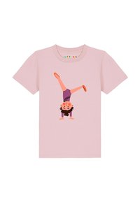 Kind trägt dunkelgrünes Hemd mit Illustration eines Mädchens im lila Trikot, das einen Handstand mit gespreizten Beinen macht.