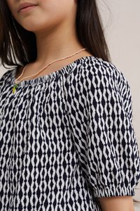 Junges Mädchen lächelt, trägt ein schwarz-weiß gemustertes Oberteil mit Puffärmeln und passende Hosen, hat langes dunkles Haar und eine Perlenkette.