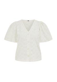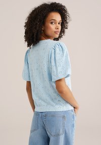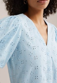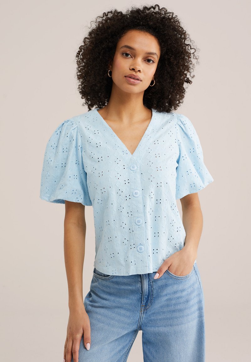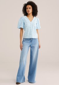 Frau mit lockigem Haar, die eine hellblaue Bluse mit Lochmuster, Puffärmeln und Knöpfen trägt, kombiniert mit hellblauen Jeans, posiert mit einer Hand in der Tasche.
