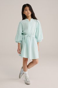 Junges Mädchen mit langen dunklen Haaren trägt ein hellblaues, tailliertes Kleid mit Puffärmeln und weiße Turnschuhe, steht vor einem neutralen Hintergrund.