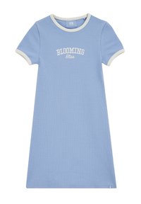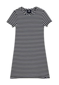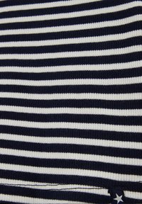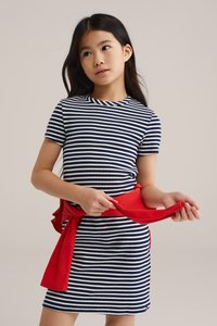 Mädchen steht und trägt ein marineblau-weiß gestreiftes Kleid, einen rot gebundenen Pullover in der Taille, weiße Socken und silberne Sportschuhe vor beigem Hintergrund.