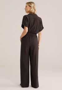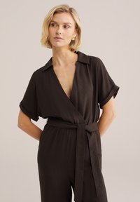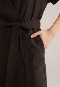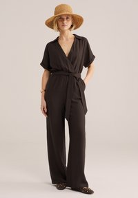 Frau trägt einen schwarzen Overall mit Gürtel, weit geschnittene Hosen, Strohhut, goldenes Armband und schwarze Slipper mit Nieten, steht vor einem einfarbigen Hintergrund.