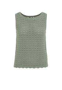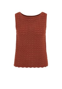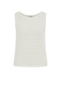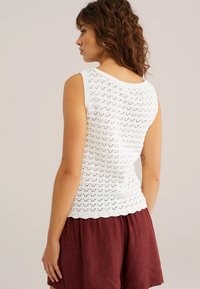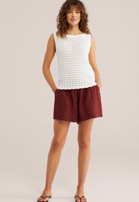 Frau mit lockigem Haar, die ein ärmelloses, weißes, gestricktes Oberteil und weite, kastanienrote Shorts trägt, stehend mit einer Hand in der Tasche.