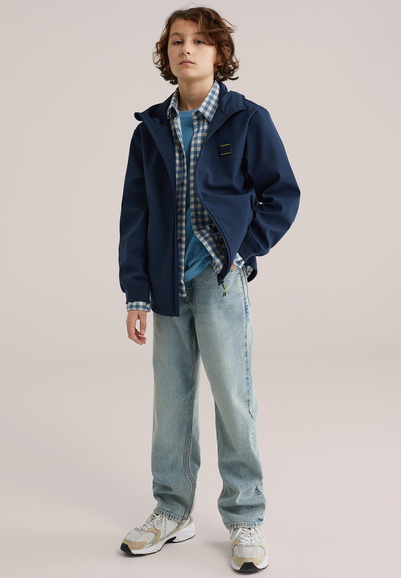 Junge steht mit den Händen in den Taschen, trägt eine marineblaue Jacke, ein blau kariertes Hemd, ein blaues T-Shirt, helle Jeans und weiße Turnschuhe.