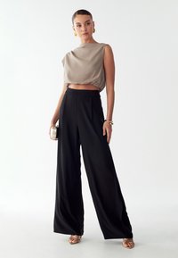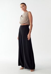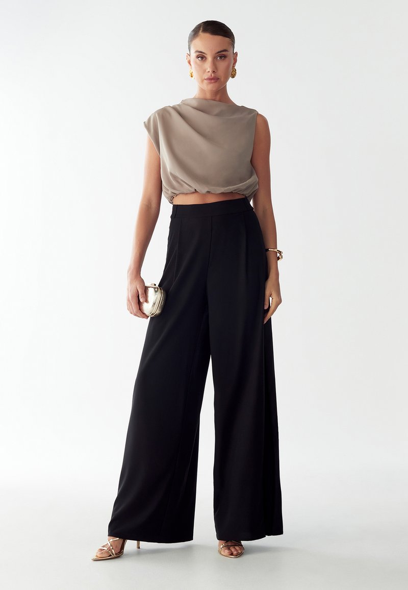 Ärmelloses, drapiertes beige Oberteil mit einem gerafften Saum, kombiniert mit hoch taillierten, weiten schwarzen Hosen. Das Model hält eine kleine silberne Clutch.