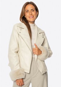 Urbane Eleganz – Kunstlederjacke mit Felldetail. Moderne Silhouette trifft auf zeitlose Eleganz – diese einzigartige Kunstlederjacke vereint Stil und zeitlosen Komfort. Sorgfältig verarbeitet bis ins kleinste Detail, vereint sie stilvollen Look mit Alltagskomfort. Der robuste Reißverschluss sorgt für ein reibungsloses Schließen, während die praktischen Druckknopftaschen Ihre wichtigen Utensilien sicher verstauen. Abgerundet wird das Design durch einen flauschigen Kunstfellkragen und Bündchen – für einen Hauch von Chic und wohliger Wärme. Für einen anderen Look öffnen Sie einfach den Kragen für einen eleganten Effekt. Für wen ist sie geeignet? Wenn Sie Wert auf Stil und Funktionalität legen, ist diese Jacke genau das Richtige für Sie. Sie ist die perfekte Wahl für kühle Morgen in der Stadt, abendliche Ausflüge oder stilvolle Alltagsbesorgungen. Ideal, wenn Sie elegant aussehen und sich wohlfühlen möchten. Unser Tipp: Kombinieren Sie dazu einen Bleistiftrock und eine schlichte Bluse und runden Sie den Look mit Blockabsatz-Stiefeletten und Goldschmuck ab. Vervollständigen Sie Ihr Outfit mit einer Shopper-Tasche, einem eleganten Schal und edlen Lederhandschuhen . Das Ergebnis? Ein Outfit, das Klasse und Stilbewusstsein ausstrahlt.