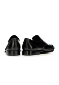 Schwarzer formeller Slipper aus Leder mit niedrigem Absatz und dekorativen Nähten vor weißem Hintergrund, seitlich betrachtet.