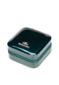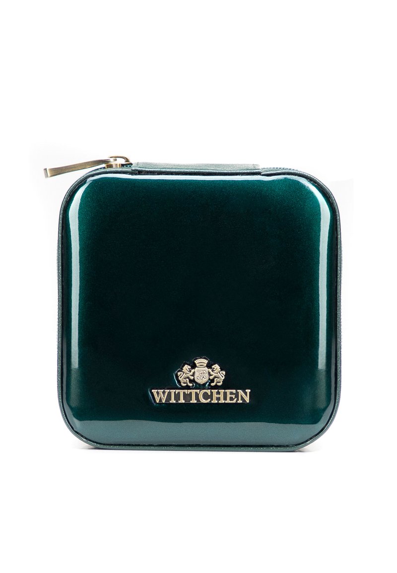 Glänzende, dunkelgrüne quadratische Reißverschlusstasche mit goldenem Wittchen-Logo und Emblem auf der Vorderseite.