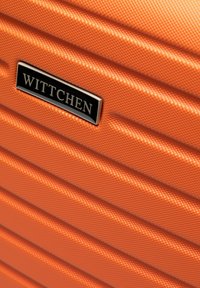 Orangener Hartschalenkoffer mit horizontalen Rillen, ausziehbarem Griff und vier Drehrollen, vorne und am Griff mit der Aufschrift "WITTCHEN".