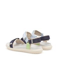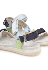 Mehrfarbige Sandalen mit Riemen in Marineblau, Hellblau und Grün. Weicher Stoff und Gummisohle, mit einem einfachen, offenen Zehendesign.