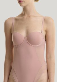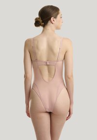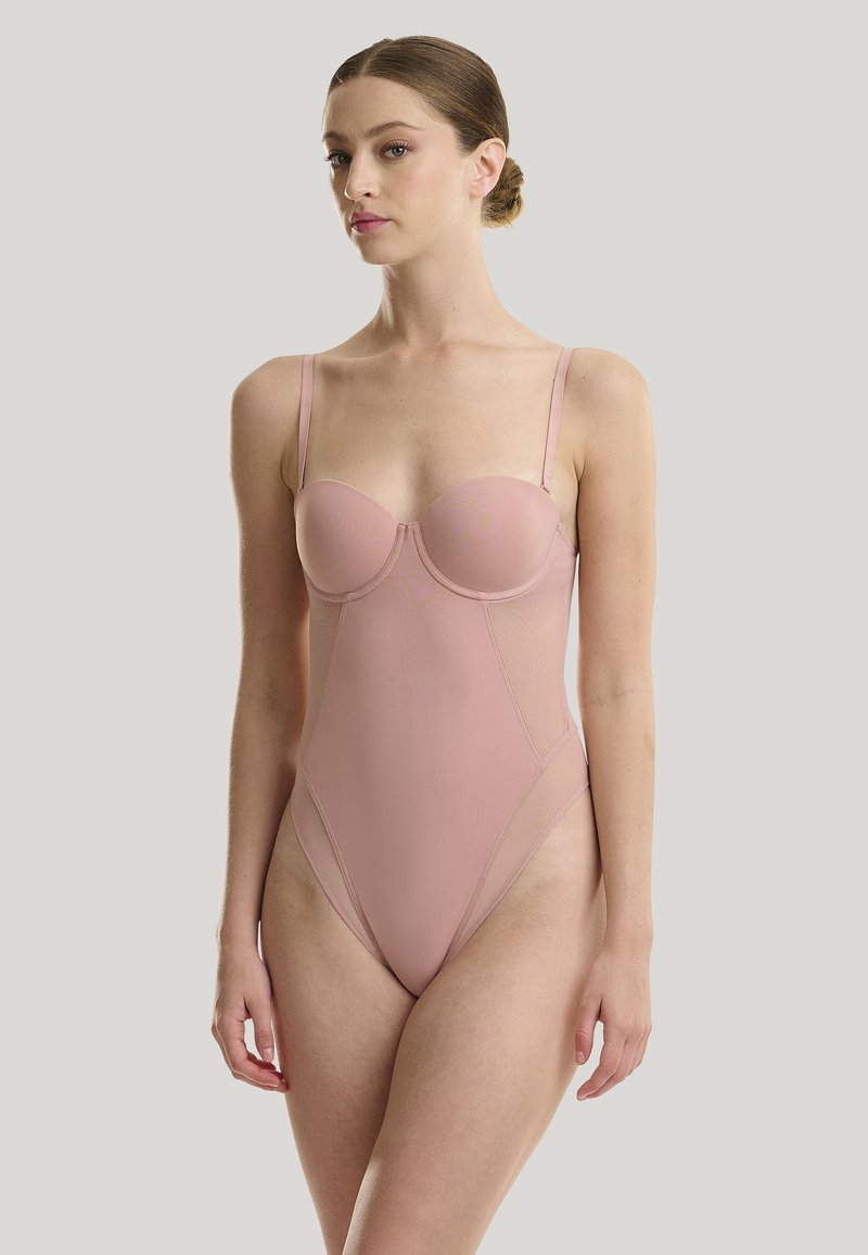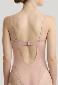 Blassrosa Body mit einer taillierten, glatten Textur. Verfügt über Unterbrustschalen, dünne verstellbare Träger und hohe Beinausschnitte für eine schlanke Silhouette.