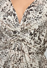 Blonde Frau trägt ein V-Ausschnitt, langärmliges Tunika mit Tierdruck und Knotendetail, schwarze Leggings, goldene Ohrringe und Armbänder, posiert vor einem einfarbigen Hintergrund.