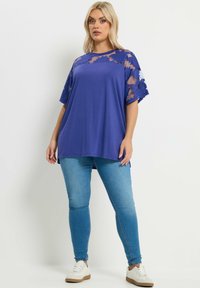 Frau trägt ein locker sitzendes, königsblaues Oberteil mit durchscheinender, floraler Spitze an Schultern und Ärmeln, kombiniert mit hellblauen Jeans, steht vor schlichtem Hintergrund.