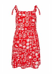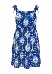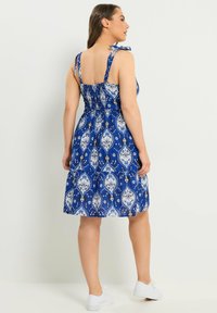 Frau in knielangem blauem Kleid mit weißen und marineblauen Blumenmustern, gebundenen Schulterträgern und weißen Turnschuhen, die mit einem Bein nach vorne steht.