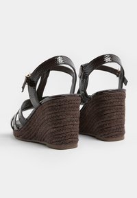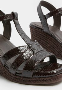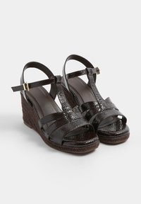 Füße mit schwarzen Keilsandalen mit strukturierten Riemen und Knöchelriemen, kombiniert mit einem weißen Rock aus Lochstickerei.