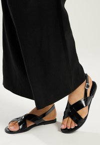 Füße in schwarzen, lackierten Sandalen mit gekreuzten Riemen und Knöchelriemen, kombiniert mit schwarzen, weit geschnittenen Hosen vor neutralem Hintergrund.