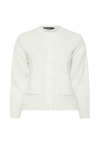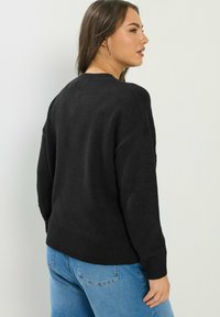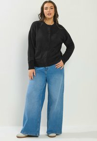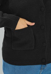 Frau mit offenem braunem Haar, die eine schwarze, mit Knöpfen versehene Strickjacke mit zwei Vordertaschen und blaue Jeans trägt, stehend vor einer schlichten weißen Wand.