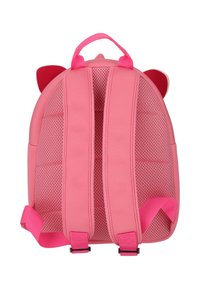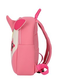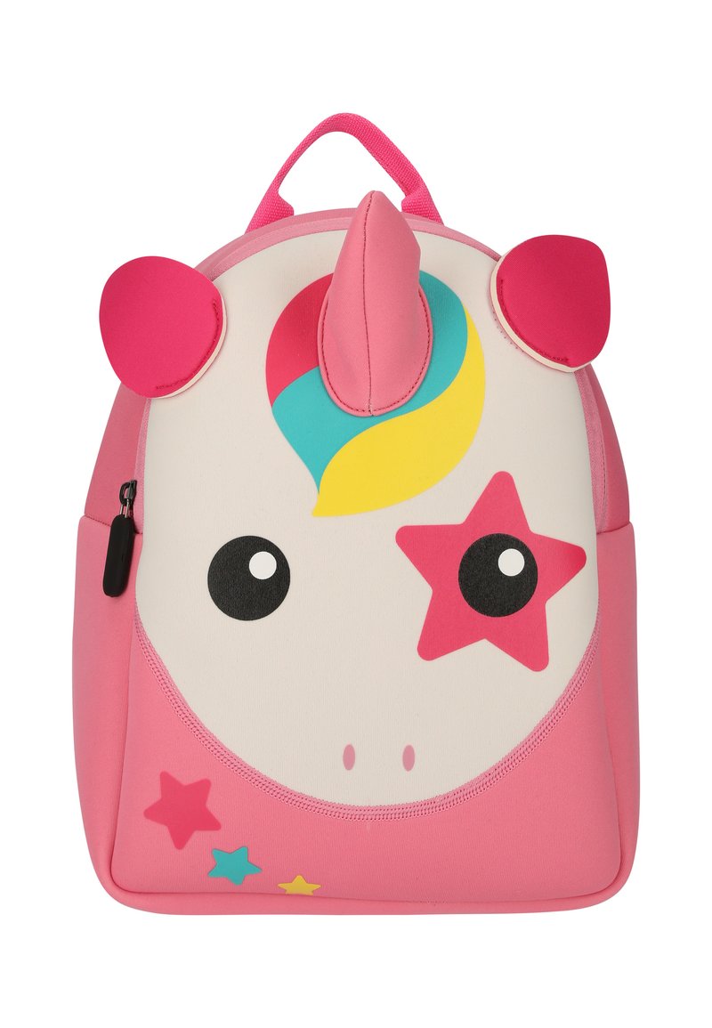 Rosa Rucksack für Kinder im Einhorn-Design mit bunter Mähne, Sternmotiv auf einem Auge, Ohren, Horn und seitlicher Reißverschlusstasche.