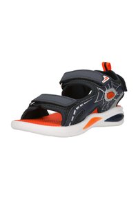 Blaue und marinefarbene Sandale mit Spinnennetzdesign, verstellbaren Riemen, gepolstertem Kragen und einer weißen Sohle mit grünen und blauen Akzenten.